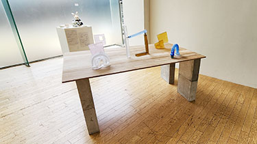 現在、制作方法が異なるキャスティングを並行して制作している。プレスすることでガラスの厚みを意図的に変えたオブジェ、ダクトホースを型取りしたもの、ドローイングを元に粘土造形したキャスティング。一つの形の中に、様々なガラスの厚みを混在させることで、一色だけのキャスティングでも、色の変化を生み出すことができる。ホースを使ったキャスティングは、見立てとして制作しているのではなく、美しいと思ったホースの形をガラスに置き換えることで、そのホースにあった美しさ、面白さ、造形の特徴がガラスに映り込むのではないかという仮説のもと制作しているもので、出てきた形をみてどのように発展させるか考えたい。 |